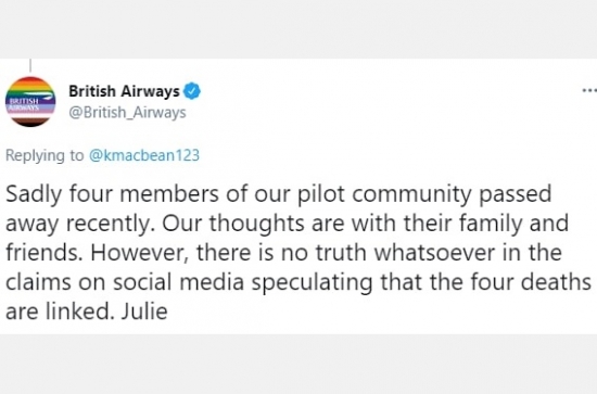 British Airways responded to the sudden deaths of four pilots: The deaths are not related in any way (19.06.2021) | 238 views | newsexchange.com ... | Similar