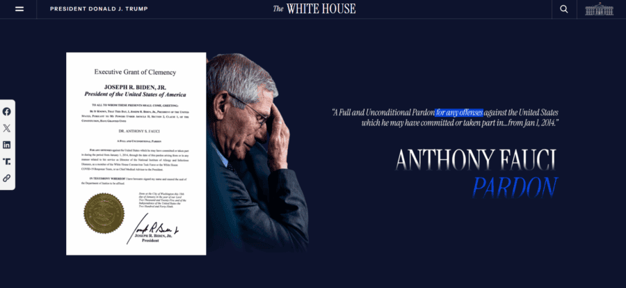 Ob Bele kuće dolazi nakon što je bivši predsednik Džo Bajden, neposredno pre napuštanja funkcije, dodelio preventivno pomilovanje dr Entoniju Faučiju, koji obuhvata period od 2014. godine do kraja njegove karijere. Ova kontroverzna odluka sprečava svaku pravnu odgovornost Faučija vezanu za poreklo virusa ili ulogu SAD u stranim istraživanjima.