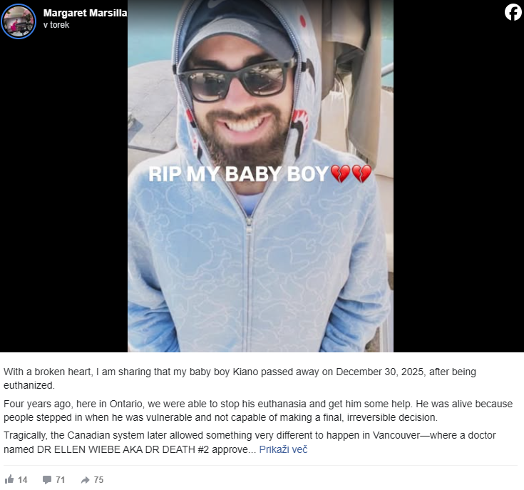 „Tragično, kanadski sustav je kasnije dopustio da se u Vancouveru dogodi nešto sasvim drugačije“, napisala je Marsilla. „Liječnica po imenu DR. ELLEN WIEBE, poznata i kao DR. SMRT #2, odobrila je njegovu smrt na temelju mentalne bolesti.“
