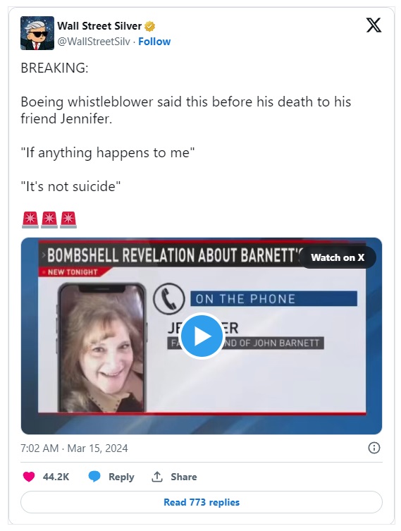 Modernity.news izveštava: Prema rečima njegovih advokata, Barnet je „izložio veoma ozbiljne bezbednosne probleme za Boing 787 Dreamliner i bio je podvrgnut odmazdi i podvrgnut neprijateljskom radnom okruženju“ i bio je usred pravnog procesa protiv Boinga.