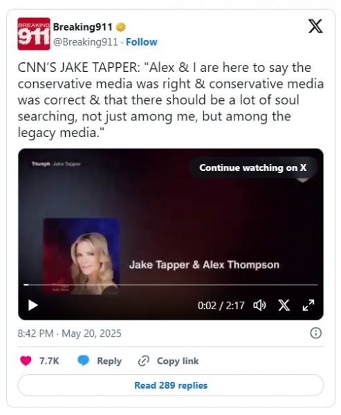 CNN’S JAKE TAPPER: "Alex and I are here to say the conservative media was right and conservative media was correct and that there should be a lot of soul searching, not just among me, but among the legacy media."
