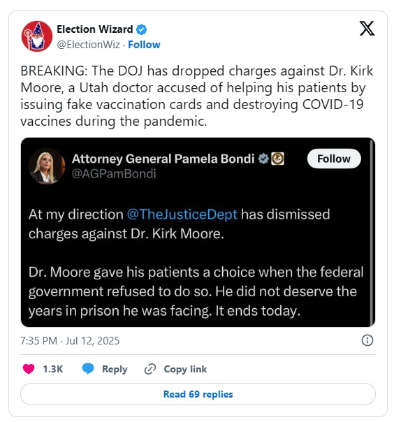 After a week-long trial in a Salt Lake City courtroom, charges against Utah doctor Kirk Moore, who was accused of running a fake COVID-19 certificate scam during the “pandemic,” have been dismissed by order of US Attorney General Pamela Bondi.