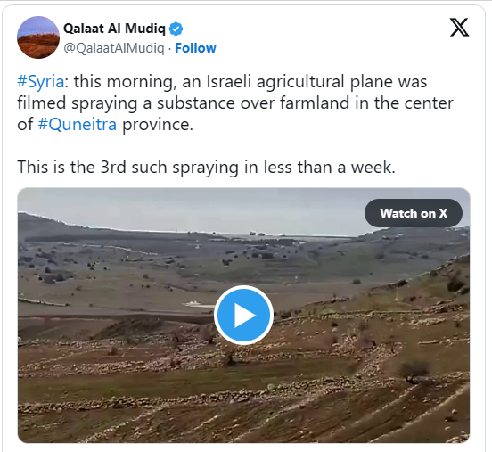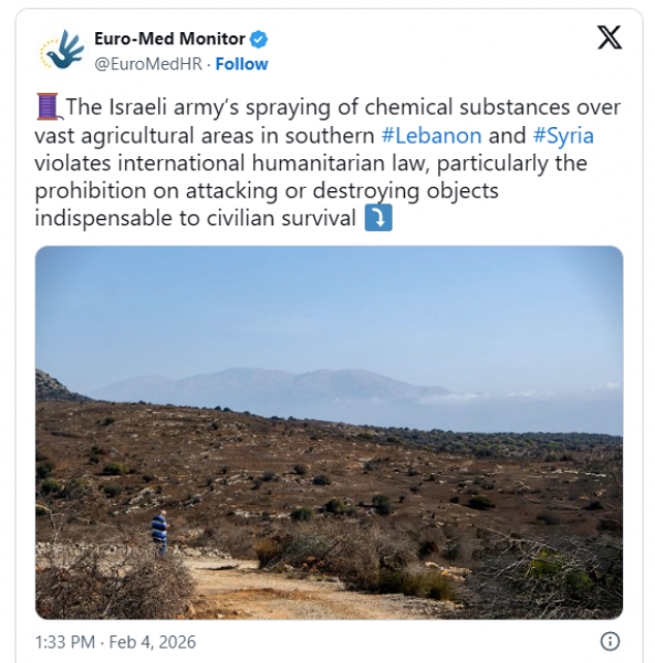 The Israeli army’s spraying of chemical substances over vast agricultural areas in southern #Lebanon and #Syria violates international humanitarian law, particularly the prohibition on attacking or destroying objects indispensable to civilian survival.