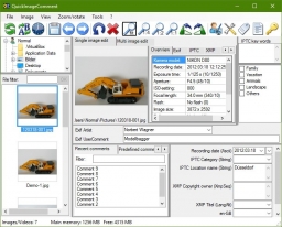 Quick Image Comment was written to enter and change simply and quickly the user comment and artist (author) in digital images (e.g. JPEG and TIFF). These attributes are read from the EXIF, IPTC, and XMP properties of the image and are stored there.
