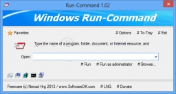 Run-Command is an alternative for the standard Windows Run dialog. The Run-Command dialog looks similar to the Windows dialog but offers a convenient "Run as Administrator" button as well as the option to save and organize your Run commands into a Favorites menu for quick access in the future.