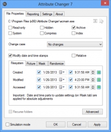 Attribute Changer allows you to easily change file attributes for single or multiple files and folders. Possible changes include Read-only, Hidden, System, Archive, Compress, Index as well as file/folder dates. If you need to change attributes on multiple files, you can use the provided filter options to limit the process by date, time, size and other attributes.