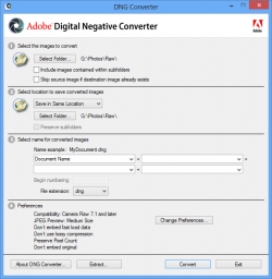 You can process entire folders or folder structures and also rename the files in the process. The converted files can be saved in a new location or you can choose to embed the original RAW file with the DNG file, which allows you to combine both formats into a single file. If you choose that option, DNG Converter provides a tool that lets you extract your original RAW files if needed.