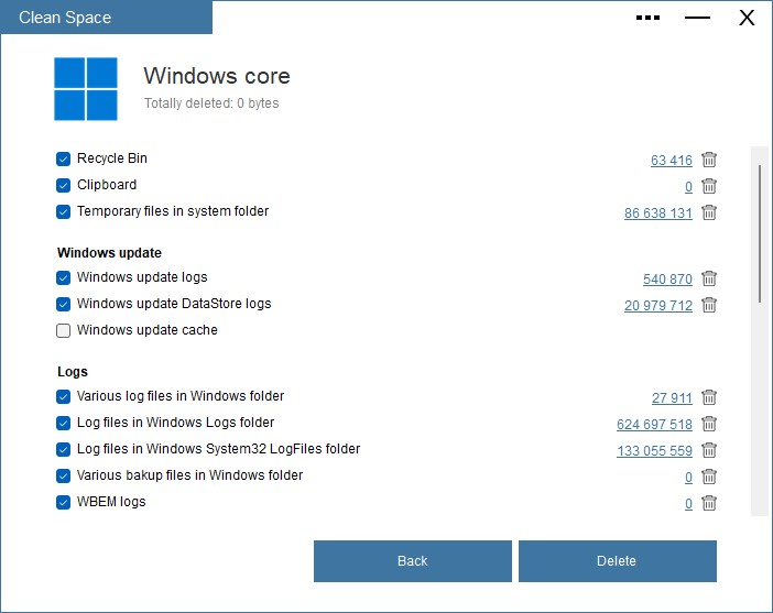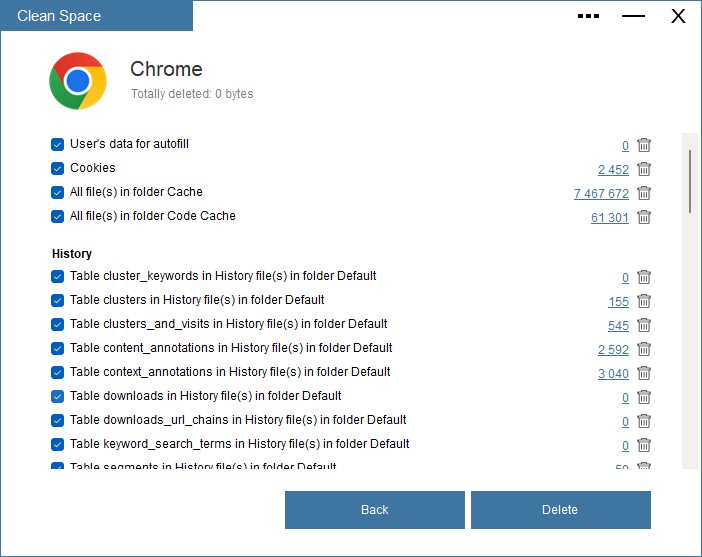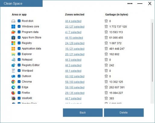 You can go into details and review all items by category and then proceed with the cleaning. The program only deletes unnecessary and temporary files, so you don't have to worry that it will remove any important data. However, you do have the option to uncheck any category to prevent the items from being deleted (e.g.if you want to keep your browser history).