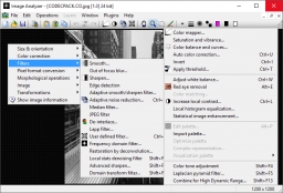 Image Analyzer allows you to resize and crop your images, apply filters and perform advanced conversions and transformations (Color model conversion, Distance, Fourier...). The program also offers automatic color correction, red-eye removal, local contrast enhancement, fading of applied filters (as in Photoshop) and an option to create user specified filters in spatial and frequency domain.