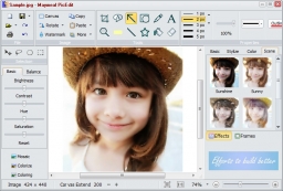 Other features include Red-Eye removal, image resizing, frames, clipart objects, watermark, crop, fill, rotate and more. It also offers a variety of image effect filters and a collection of frames and masks that can be applied to enhance your photos.
