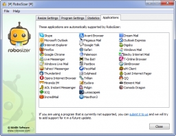 RoboSizer is a fully automatic image resizing software that will change the way you share your photos with friends and family. Unlike other image resizing tools that require manual image resizing or are limited to a few email programs, RoboSizer works with all your favorite email programs, instant messengers and web browsers without any user intervention - your photos are automatically resized whenever they are attached or uploaded.
