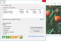 FreeSizer features include custom profiles option, batch resize multiple images, built-in preview to test resizing settings, custom profiles option, automatic file naming, high quality resizing algorithm and more.