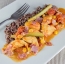 Recept za golaž iz puranjega mesa z bučkami, koruzo, paradižnikom in šunko. ...