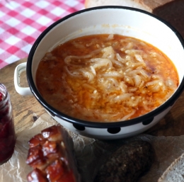 Medtem pripravimo prežganje do svetlo rjave barve, dodamo čebulo, in jo pražimo do temno rjave, posipamo z mleto rdečo papriko, zalijemo z 2 dl mrzle vode, premešamo in pustimo, da zavre.