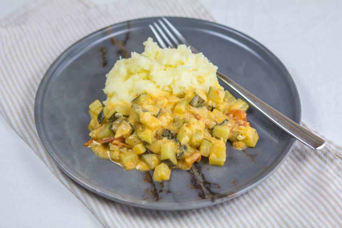 1 kos Čebula Olje - sončnično 600g Bučke 1 kos Paradižnik - svež Sol Poper Bazilika Rožmarin 1 čajna žlička Gorčica 100g Kisla smetana 1 žlica Parmezan