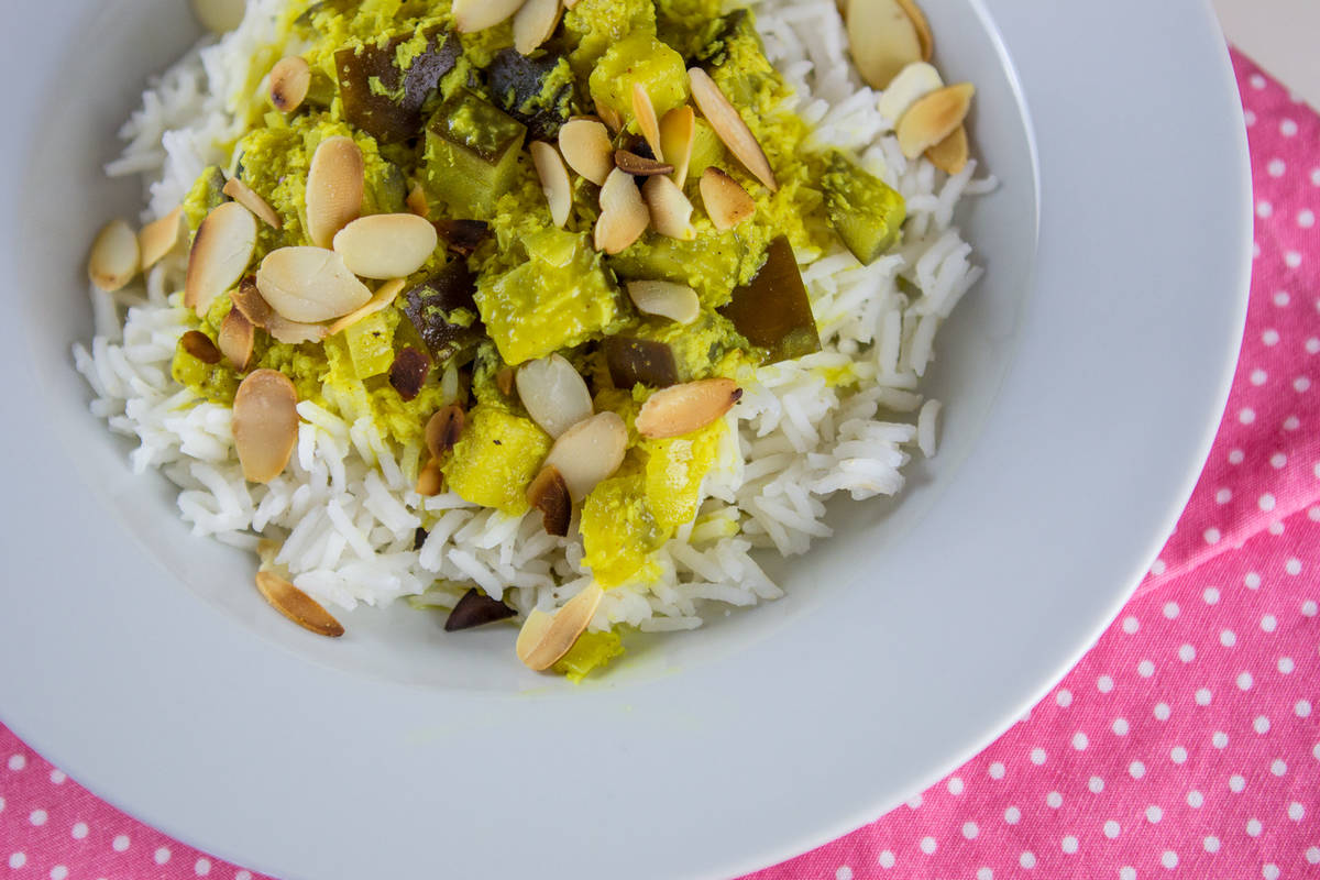 2 kosa Čebula 700g Jajčevci 6 žlic Olje - sončnično Sol Poper 400g Kokosovo mleko Svež limonin sok 3 žlice Kokosova moka 1 čajna žlička Cimet 1 čajna žlička Kurkuma Feferon - pekoč 100g Mandlji