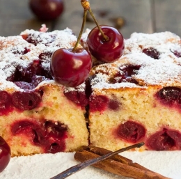500 g razkoščičenih višenj 120 g stopljenega masla 100 g pasirane skute 100 g navadnega jogurta 2 jajci 130 g sladkorja 1 vaniljev sladkor 1 žlička cimeta 1 neškropljena limona- lupinica 250 g moke 1 vrečka pecilnega praška 1/4 žličke soli 1 žlica sladkorja v prahu