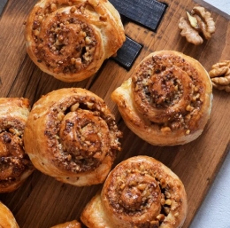 4 Vzhajano testo na rahlo pomokanem prtu razvaljamo na približno 3 mm debelo. Nanj namažemo nadev in testo s pomočjo prta čim bolj tesno zvijemo. Zavitek zrežemo na 1-2 cm velike kolutke, ki jih polagamo na pekač, obložen s peki papirjem. Med njimi pustite dovolj prostora, ker bodo še vzhajali.