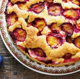 3 Testo prelijemo v pomaščen pekač in nanj polagamo slive, obrnjene navzgor. Pečico segrejemo na 180°C in pecivo pečemo približno 30 minut. Naredimo preizkus z zobotrebcem (če se nanj testo ne prime, je pecivo pečeno) in po potrebi peko podaljšamo.