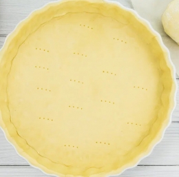 Dno dobro prebodemo z vilicami, na testo položimo peki papir in ga obtežimo s suhim fižolom ali utežmi za slepo peko. Pečemo 10 minut v ogreti pečici (180°C), nato odstranimo peki papir z utežmi in pečemo še 10 minut, da se zlato-rumeno obarva.