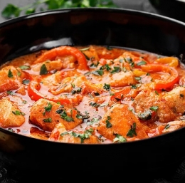 V posodo zlijemo še precejeno ribjo osnovo, dodamo lovor, poper v zrnju, papriko in paradižnik, prilijemo še vino in sladko in pekočo papriko.