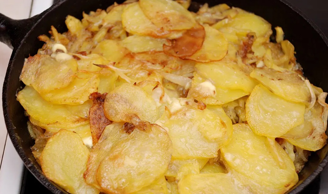 Krompir narežemo na kolobarje in ga dodamo prepraženi čebuli. Ves čas skupnega praženja krompir mešamo in obračamo, da se enakomerno prepraži. Med praženjem dodamo malo soli in popra.