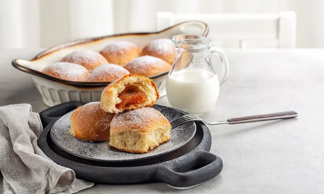 Po približno 15 minutah peke (sredna lega) buhteljne pokrijemo s peki papirjem, da se po vrhu ne zažgejo. Pečemo še 20-25 minut. Pečene posipamo s sladkorjem v prahu in pustimo, da se nekoliko ohladijo. Postrežemo za zajtrk ali kot sladico po enolončnicah.