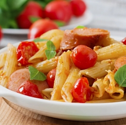 Če iščete hitro in okusno jed, ki združuje preproste sestavine in bogate okuse, je tale recept kot nalašč za vas. Testenine s paradižnikovo omako, svežimi paradižniki in baziliko prinašajo klasičen okus Italije, medtem ko so hrenovke tiste, ki dodajo prijeten mesni pridih. Ta jed je popolna za tiste, ki želijo nekaj nasitnega, a preprostega za pripravo.