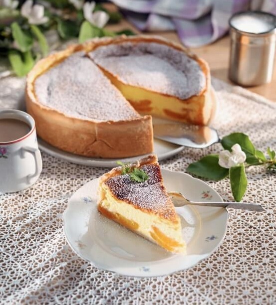 Testeno podlago obložimo z breskovimi rezinami in po njih porazdelimo skutno maso.
