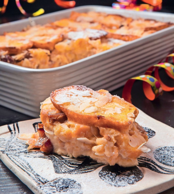 Pekač za narastke velikosti 20 x 30 cm namažemo z maslom. Pečico segrejemo na 180 °C. Krofke narežemo na tanke rezine in jih zložimo v pekač v kot opeke, mednje pa razporedimo drobno narezane datlje in 4 žlice mandljevih lističev.