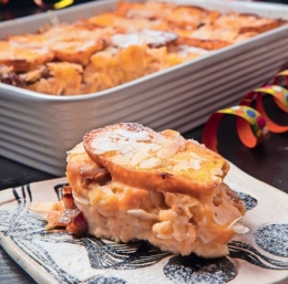 Z jajčno mešanico prelijemo krofke, zmes naj ne zalije vrhnje plasti krofkov. Po vrhu potresemo s preostalimi mandljevimi lističi in postavimo v pečico za 15 minut, nato narastek vzamemo iz pečice, ga posujemo s sladkorjem v prahu in še vročega postrežemo.
