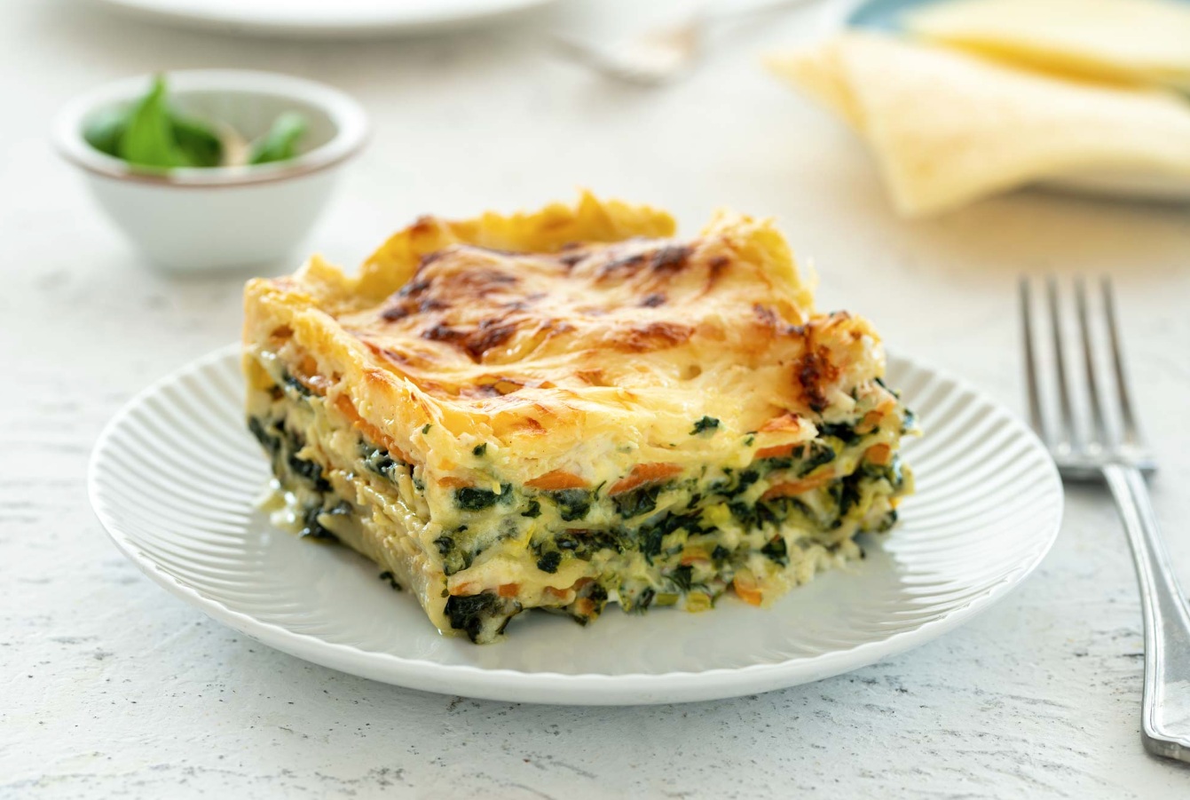 200 g testenin za lazanjo 30 g moke 30 g masla 600 ml mleka 1 lovorjev list ⅛ žličke muškatnega oreščka 50 g naribanega sira gauda 500 g sveže špinače 100 g pora 3 stroki česna 300 g korenja 180 g mozzarelle v lističih 60 g naribanega sira tilzit Olivno olje Sol in poper