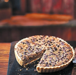 Orehova jedrca drobno sesekljamo. Čokolado narežemo na koščke. V skledi razžvrkljamo jajca. Dodamo jim sirupovo mešanico, vaniljo in orehe ter temeljito razmešamo. Polovico mešanice zlijemo v pečeno testo, jo potresemo s polovico čokoladnih koščkov, prekrijemo s preostalim nadevom in potresemo z drugo polovico čokolade. Postavimo na mrežico na sredini pečice in pečemo 50 do 55 minut, tako da postane nadev čvrst. Nato vzamemo pito iz pečice in jo pustimo, da se ohladi. Preden postrežemo, jo vsaj za 2 uri postavimo v hladilnik.