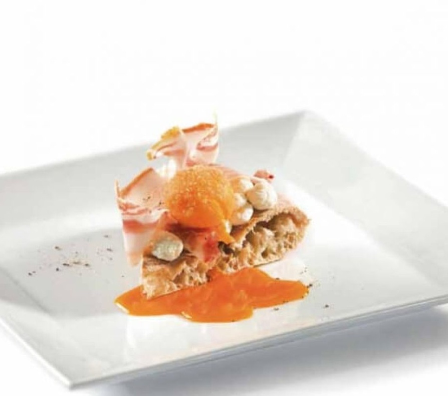 Rumenjak prekrijemo z drobtinami in za 4 ure postavimo v hladilnik. Maskarpone in parmezan gladko zmešamo in z brizgalno vrečko nabrizgamo na testo. Po njem položimo tanke rezine mesnin.