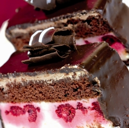 Čokolado nalomimo na koščke, damo v posodico in stopimo nad soparo. Sladico oblijemo s stopljeno čokolado. Ko se čokolada strdi, sladico narežemo ter rezine okrasimo z ostružki čokolade in malinami.