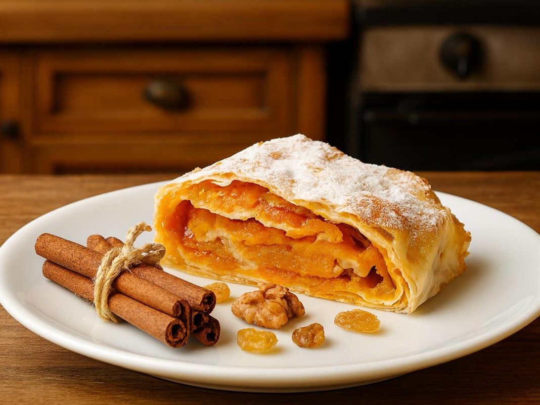 Ko zadiši po pečeni buči in hrustljavem testu, veste, da prihaja jesen. Ta recept za domač bučni štrudelj vas bo očaral s preprostim testom, mehkim in sočnim nadevom ter prijetnim vonjem cimeta, ki se razleze po kuhinji.