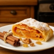 Postrezite še tople kose štrudlja, po želji posujte s sladkorjem v prahu. Hrustljavo testo in nežno sladek nadev vas bosta spomnila na okuse babičine kuhinje.