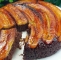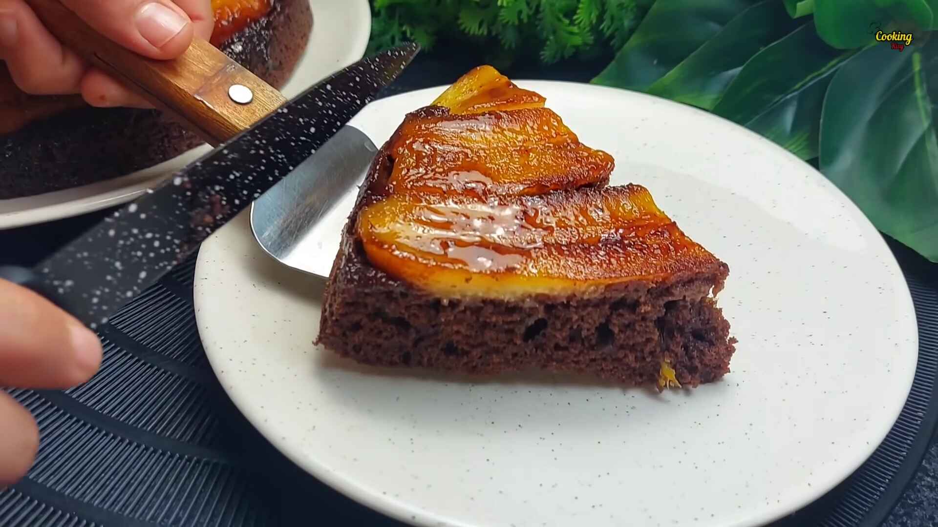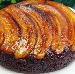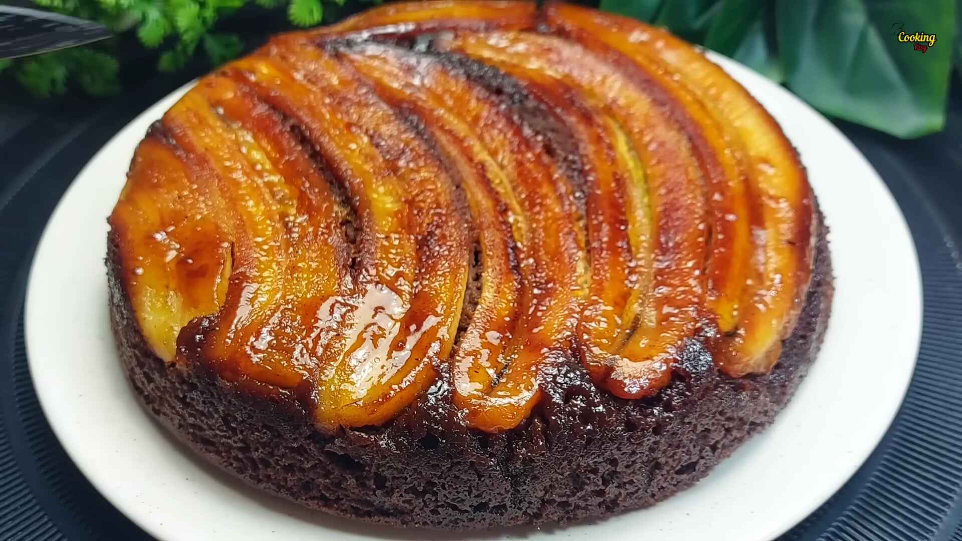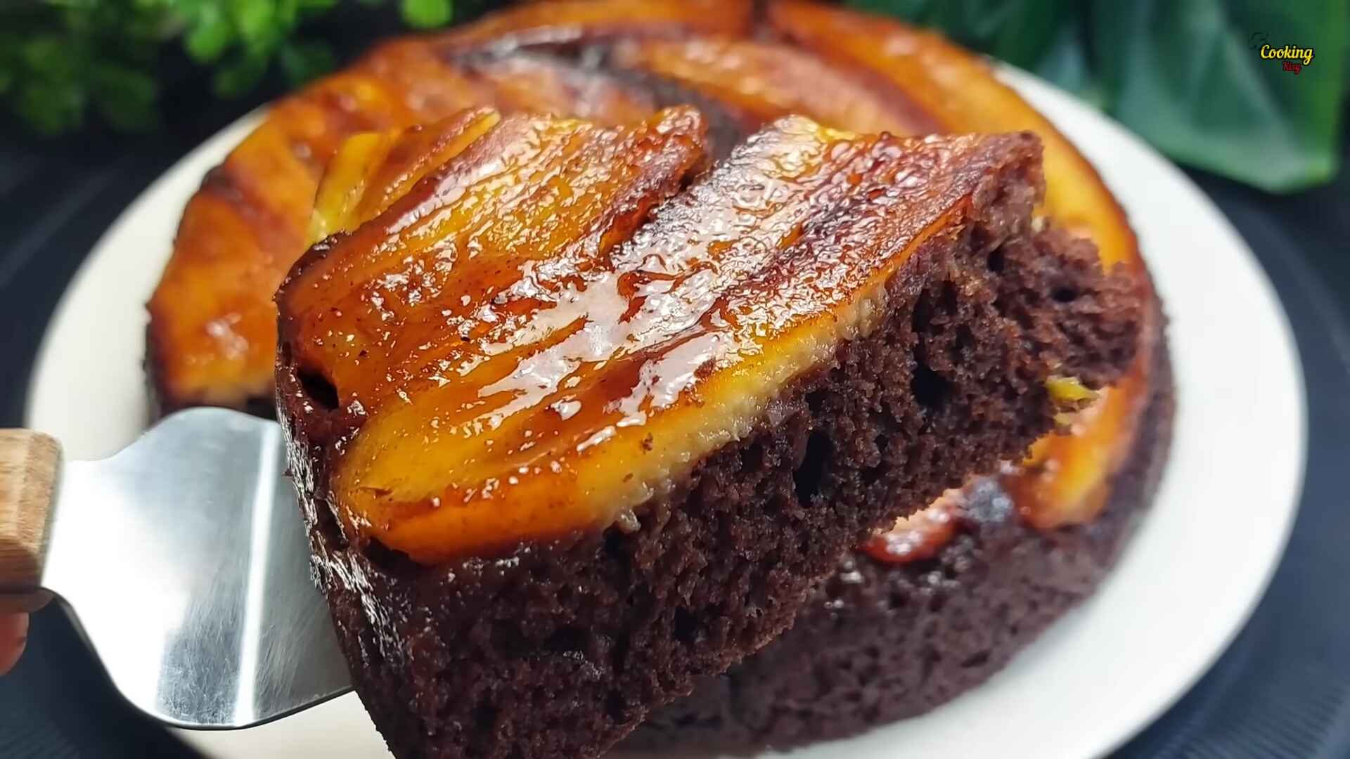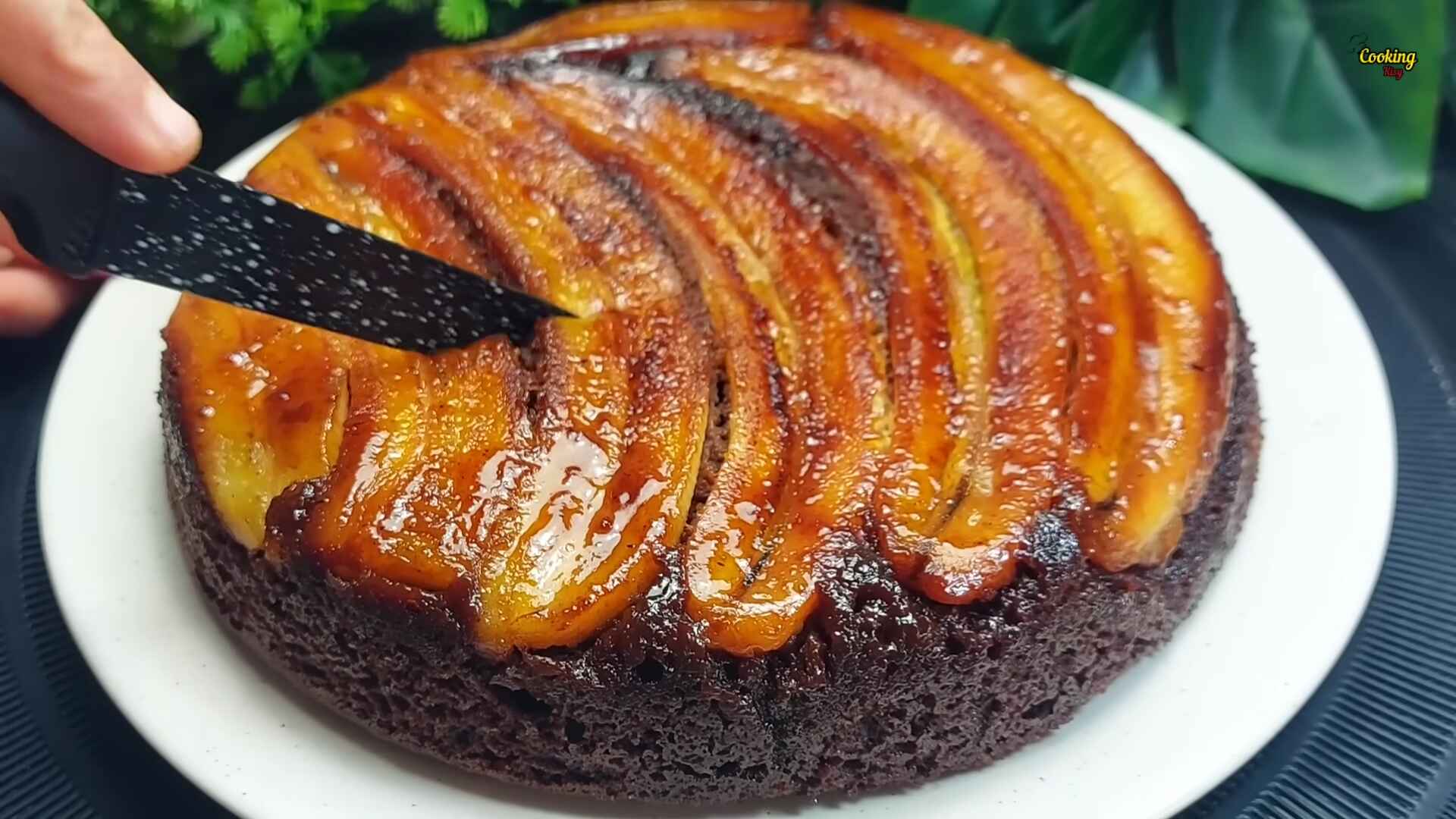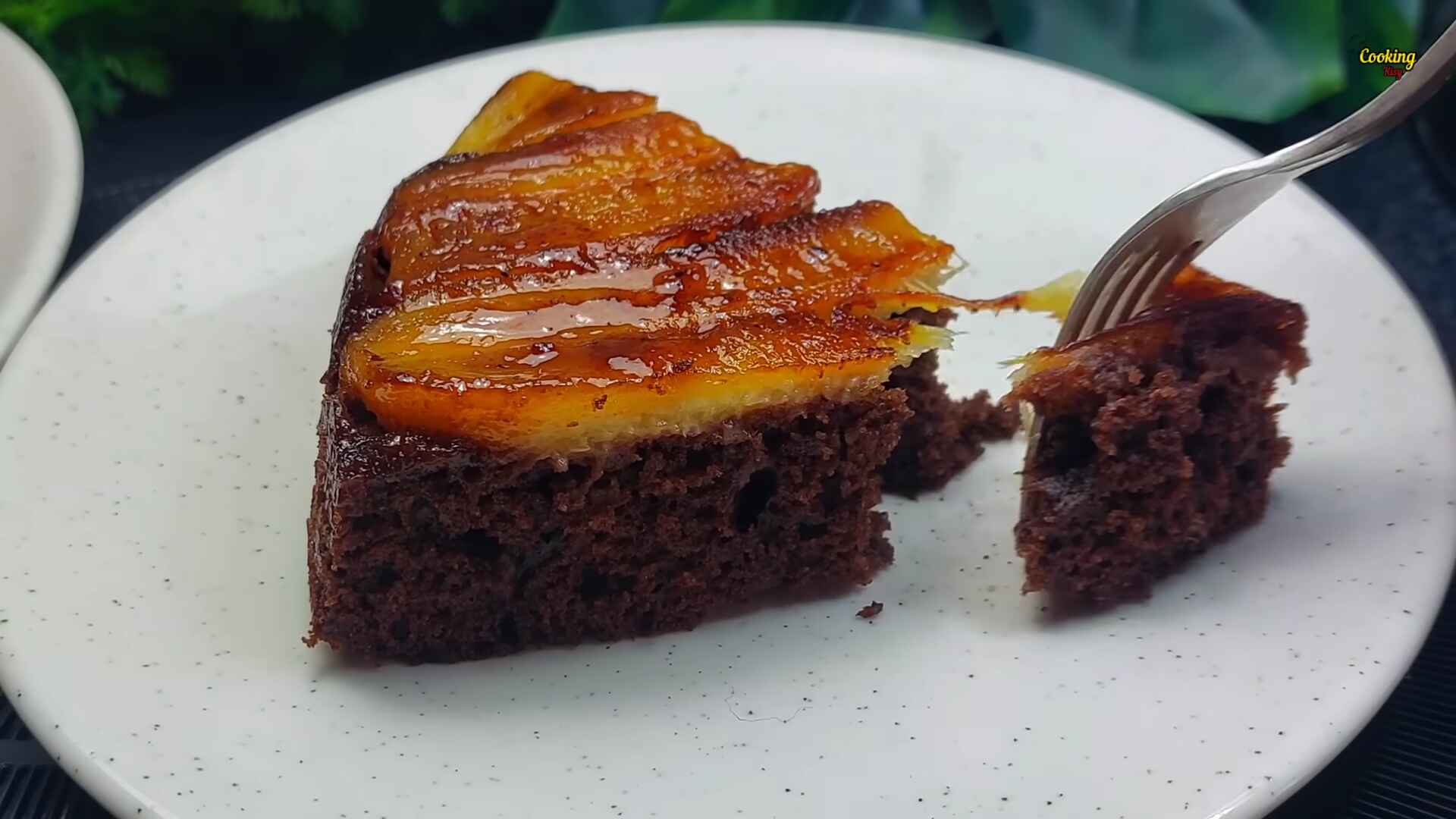 Če je testo pečeno, enostavno preverimo z zobotrebcem. Če zobotrebec ostane suh, ko ga zapičimo v testo, je okusna sladica pripravljena. Preostane nam le še, da jo položimo na krožnik, in sicer tako, da je del z bananami na vrhu.