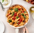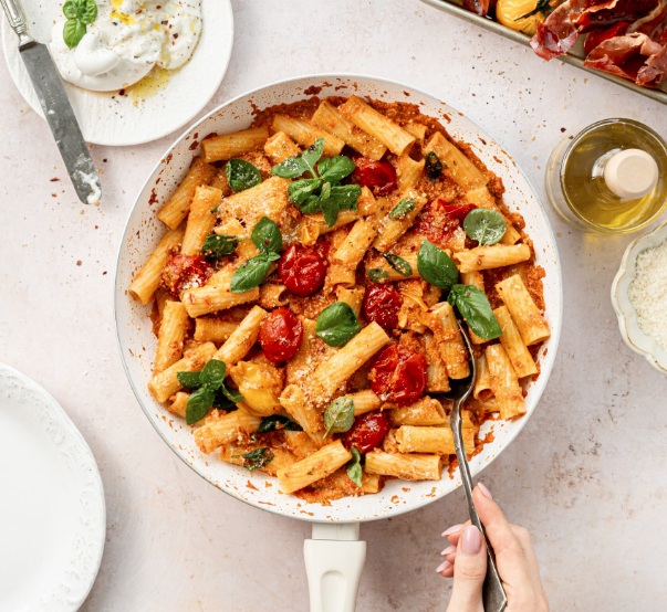 Postavite v pečico in pecite 15 minut oz. toliko časa, da se paradižnik zmehča, pršut pa hrustljavo zapeče. Vzemite in pečice in pustite. V večjem loncu vrele osoljene vode skuhajte izbrane testenine po navodilih na embalaži, do “al dente” stanja torej da so na ugriz še malo trde.