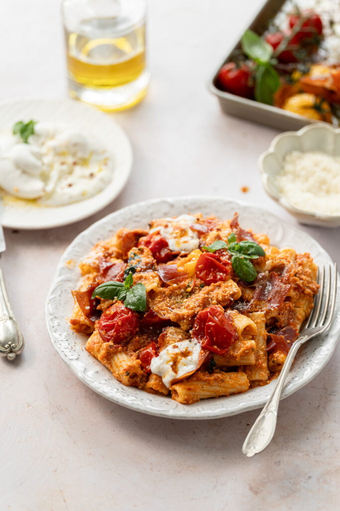 Dodajte 1/2 skodelice vode, v kateri so se kuhale testenine in premešajte. Dodajte še kuhane testenine, popečen češnjev paradižnik (iz pečice), liste sveže bazilike in olivno olje ter tekočino, ki se je nabrala na dnu pekača, v katerem smo pekli paradižnike s pršutom.