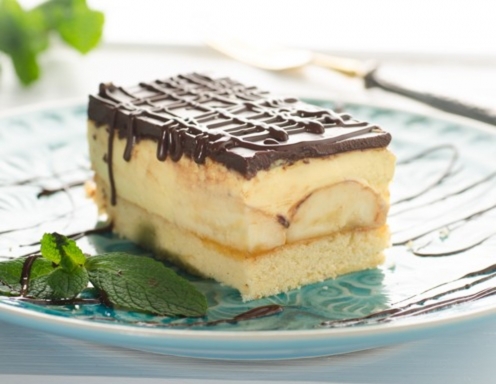 5 jajc, 250 g sladkorja, 250 g moke, 1 noževa konica pecilnega praška, 3 žlice olja, 1 zavitek vanilijevega sladkorja, 2,5 vrečki pudinga (vanilija), 250 g margarine, marelična marmelada, 1/2 tablice čokolade, 10 banan, margarina (za čokolado). PRIPRAVA: