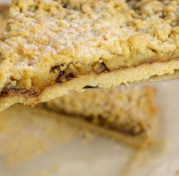 Na testo z namazom enakomerno razporedite karamelizirane banane. Nato po vrhu naribajte preostanek testa iz zamrzovalnika, da dobite rahlo drobljiv videz.