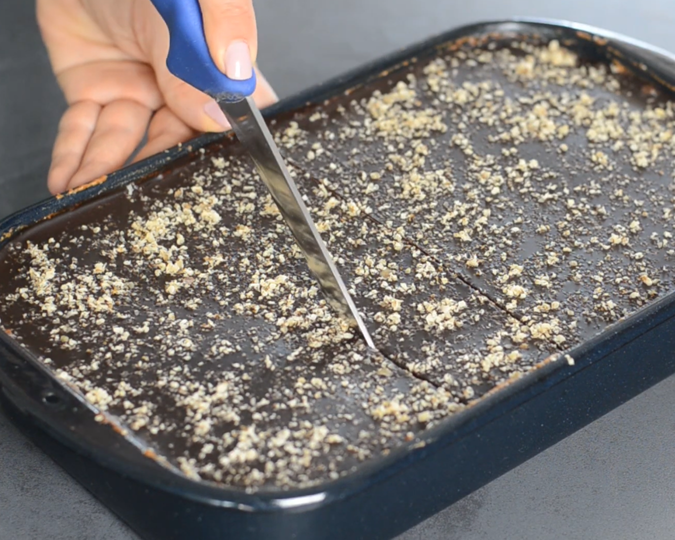Ganache premažite po ohlajenem pecivu in posujte z mletimi orehi. Dobro ohladite.