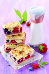 - 150 g ribezove marmelade - 80 g kokosovih ostružkov - 600 g me??anega jagodičevja (ribez, maline, robide, borovnice) - 500 g puste skute - 50 g masla - 120 g sladkorja v prahu - 1 zavoj vaniljevega pudinga - 2 jajci - 250 ml sladke smetane