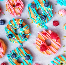 – 500 g listnatega testa – 100 g kremnega sira – 120 g sladkorja v prahu – 0,3 dl stopljenega masla – 0,2 dl mleka – jedilna barva (rdeča, modra) – maline, borovnice – pisane sladkorne mrvice – olje za cvrtje