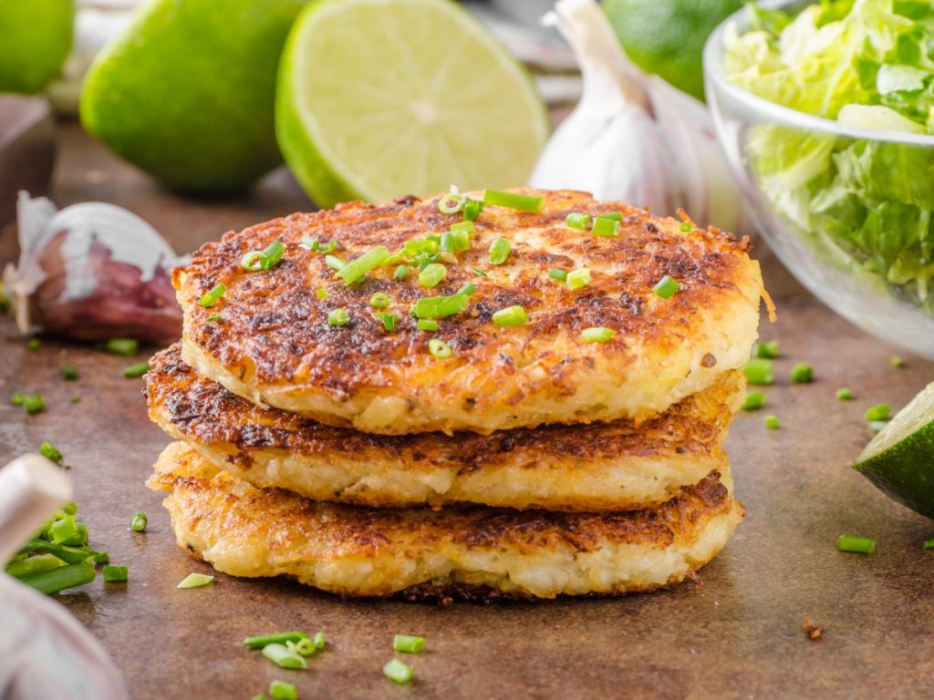 1 kg krompirja 2 korenčka 1 čebula 2 jajci 2–3 žlice moke 1 žlica drobtin sol, poper, olje 1 žlica kisle smetane Priprava