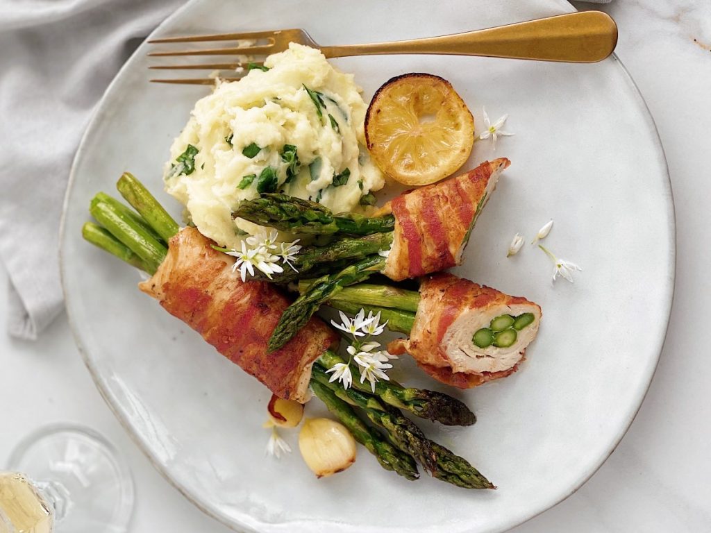 Kot prilogo k špargljevim zvitkom najraje pripravim pire krompir s čemažem. Če čemaža nimamo, lahko v pire dodamo malo pečenega česna in dobimo prav tako čudovito prilogo. Seveda pa se k tej jedi krasno poda tudi pečen mladi krompir, lahko pa tudi riž … Namesto piščančjih zrezkov lahko šparglje ovijemo tudi v puranje zrezke ali file ribe (brancin, oslič, postrv…).