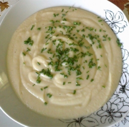 1/2 glave cvetače 1 krompir 1 čebula 2 stroka česna 1/2 litra zelenjavne juhe sol in poper svež sesekljan drobnjak