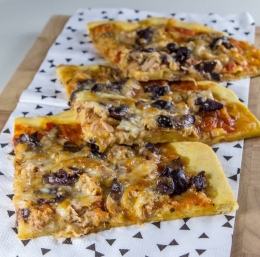 Testo razvaljamo. Premažemo ga s paradižnikovo omako in obložimo s tunino, olivami in ovčjim sirom.