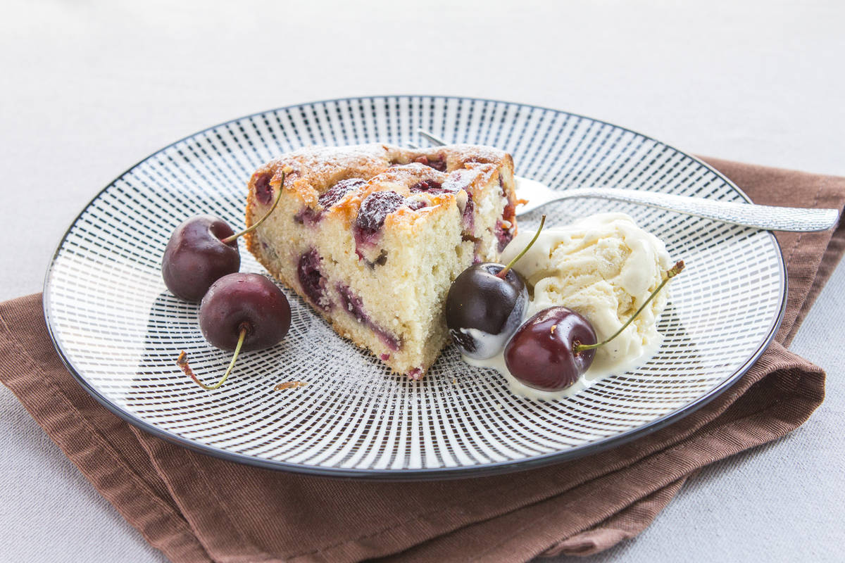 Češnje razkoščičimo. 200g češenj povaljamo v preostali moki.